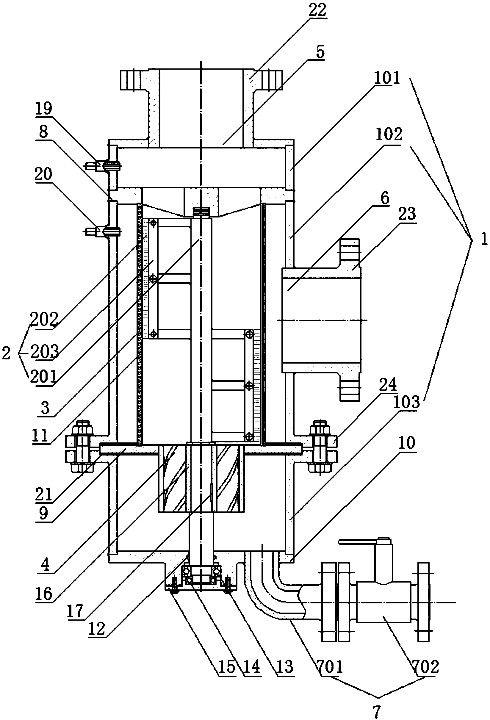 9.根據(jù)權(quán)利要求8所述的渦輪式自清洗廢水過濾器,其特征在于:所述進(jìn)水口(5)連接第一法蘭(22)、出水口(6)連接第二法蘭(23),所述上筒體(101)、上支撐板(8)、中間筒體(102)依次焊接,中間筒體(102)通過第三法蘭(24)與下筒體(103)連接,所述下筒體(103)和底板(10)焊接。