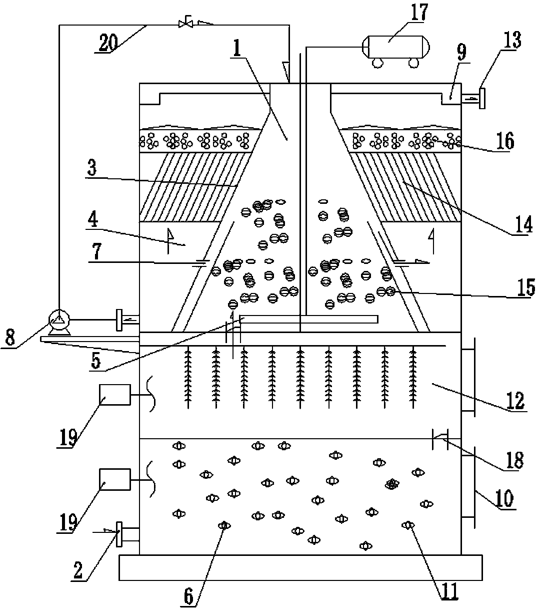同時本發明流化床生化區的結構設計,能夠最大限度的提高濾料層的面積,同時在流化床生化區的下部形成較大的懸浮生物反應空間,進一步提高污水處理的效果,提高本發明的實用性。
