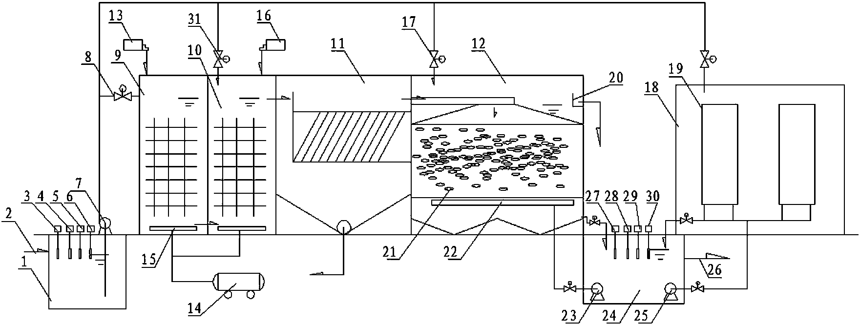 所述除磷池和絮凝池的底部設置有曝氣管,所述曝氣管與設置除磷池和絮凝池外部的空壓機連通。