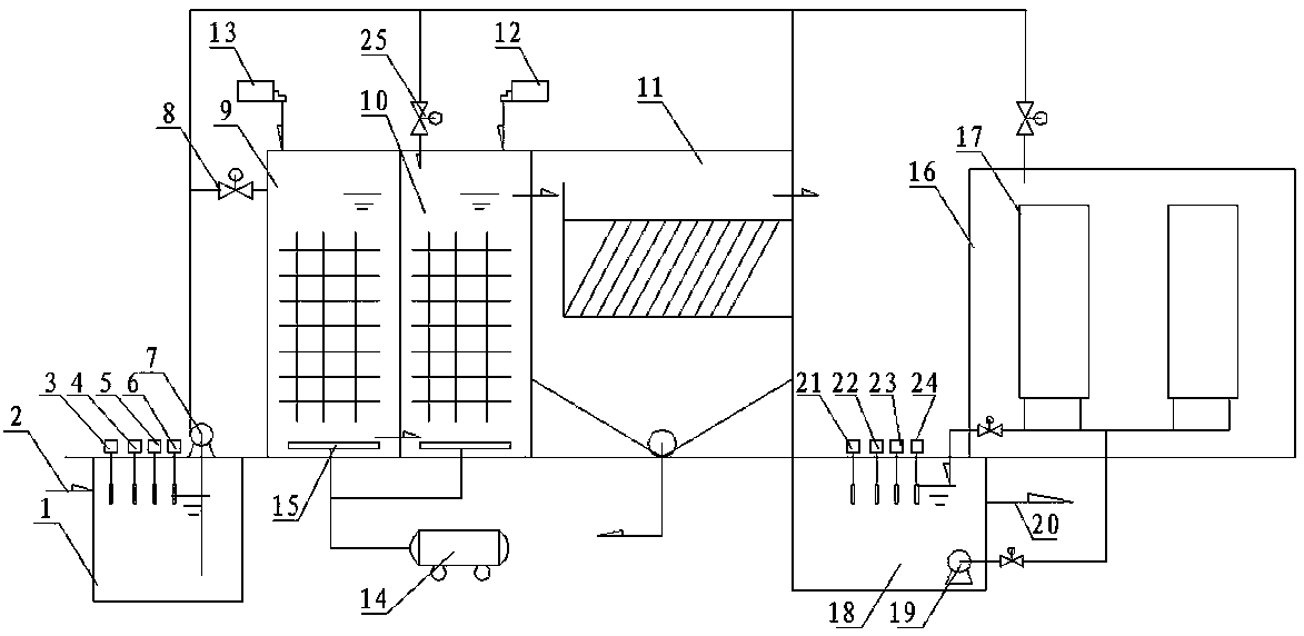 所述清水池配設有出水檢測儀、出水濁度檢測儀、出水氨氮檢測儀和出水總磷檢測儀。