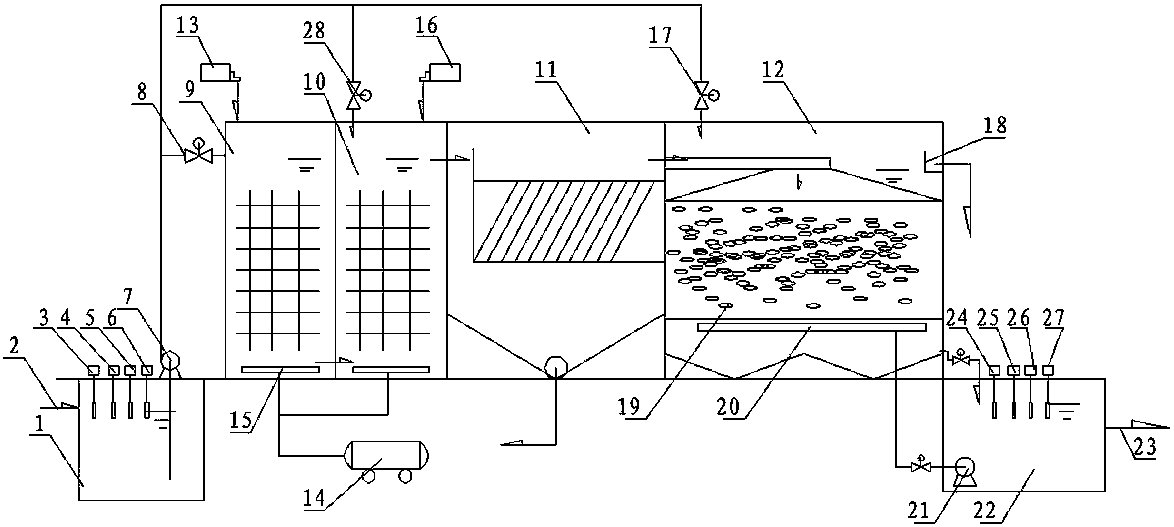 所述除磷池和絮凝池的底部設置有曝氣管,所述曝氣管與設置除磷池和絮凝池外部的空壓機連通。
