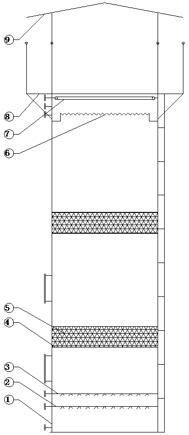 1.一種一體化塔式含硫廢水處理裝置,其特征是:包括一體化鋼塔體(1)、進水布水裝置(2)、空氣曝氣裝置(3)、填料固定塔盤(4)、不銹鋼鮑爾環填料(5)、出水溢水堰(6)、塔頂消泡噴淋裝置(7)、塔頂可拆卸式爬梯平臺(8)及塔頂可拆卸式防雨罩(9),所述的進水布水裝置、空氣曝氣裝置、填料固定塔盤、不銹鋼鮑爾環填料、出水溢水堰和塔頂消泡噴淋裝置均設置在一體化鋼塔體內,其中進水布水裝置和空氣曝氣裝置位于一體化鋼塔體內的下部,且空氣曝氣裝置位于進水布水裝置之上,填料固定塔盤位于空氣曝氣裝置之上,其上均勻堆積有不銹鋼鮑爾環填料,出水溢水堰與塔頂消泡噴淋裝置位于一體化鋼塔體內的上部,且塔頂消泡噴淋裝置位于出水溢水堰的上方;在一體化鋼塔體的頂部設置有塔頂可拆卸式爬梯平臺,在塔頂可拆卸式爬梯平臺的上方連接有塔頂可拆卸式防雨罩。