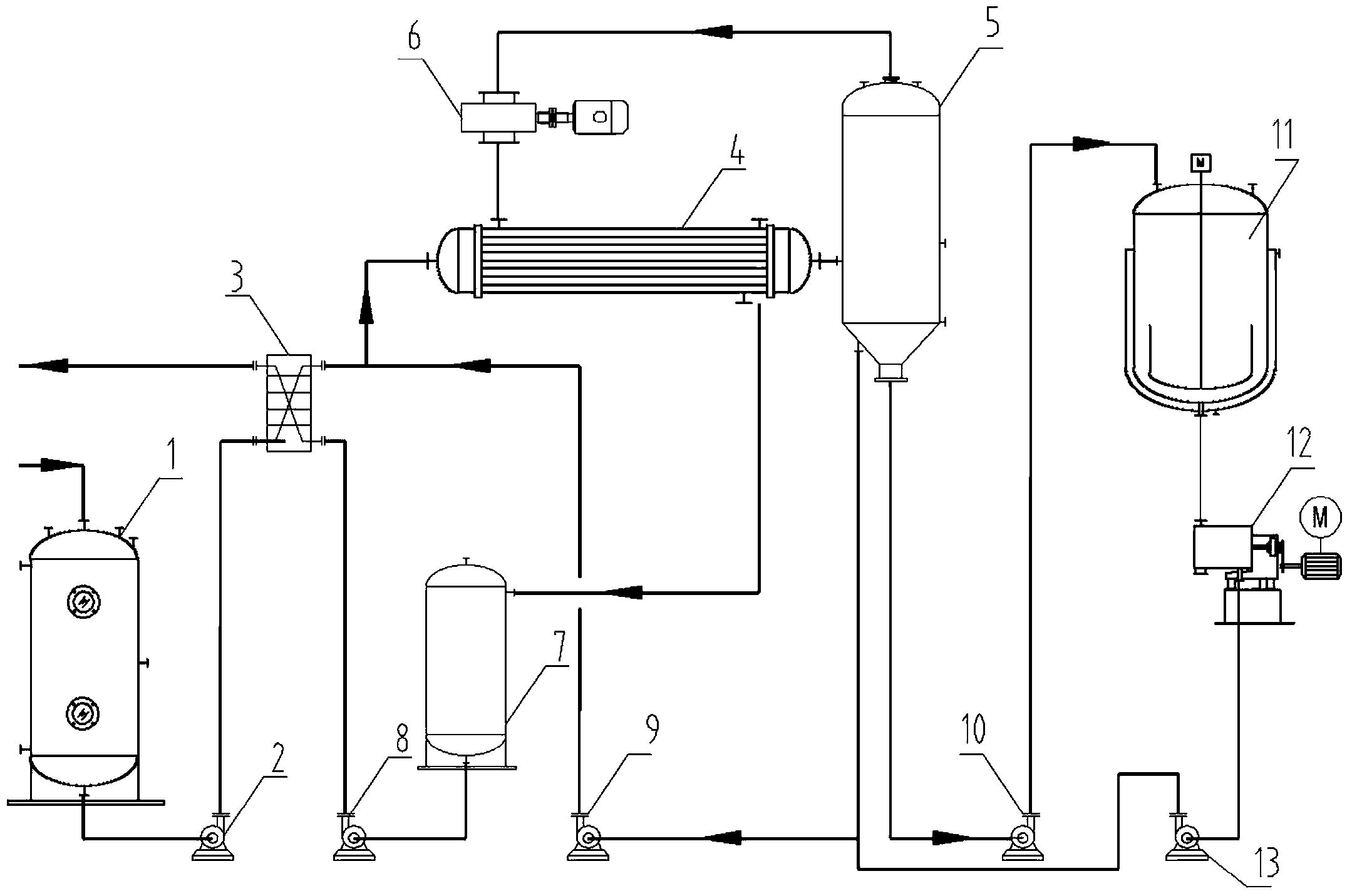 作為本發(fā)明的一種有優(yōu)選的方案,所述主換熱器和分離器通過管道連接構(gòu) 成一閉合回路,在管道上設(shè)有一循環(huán)泵,預(yù)熱后的雜鹽廢水進(jìn)入主換熱器與加 熱蒸汽換熱,獲取熱量的雜鹽廢水進(jìn)入分離器閃蒸分離出二次蒸汽和濃縮液, 濃縮液重新進(jìn)入閉合回路通過循環(huán)泵作用,不斷經(jīng)過主換熱器和分離器閃蒸分 離作用,最終達(dá)到過飽和狀態(tài)從分離器泵入冷卻結(jié)晶器進(jìn)行結(jié)晶。