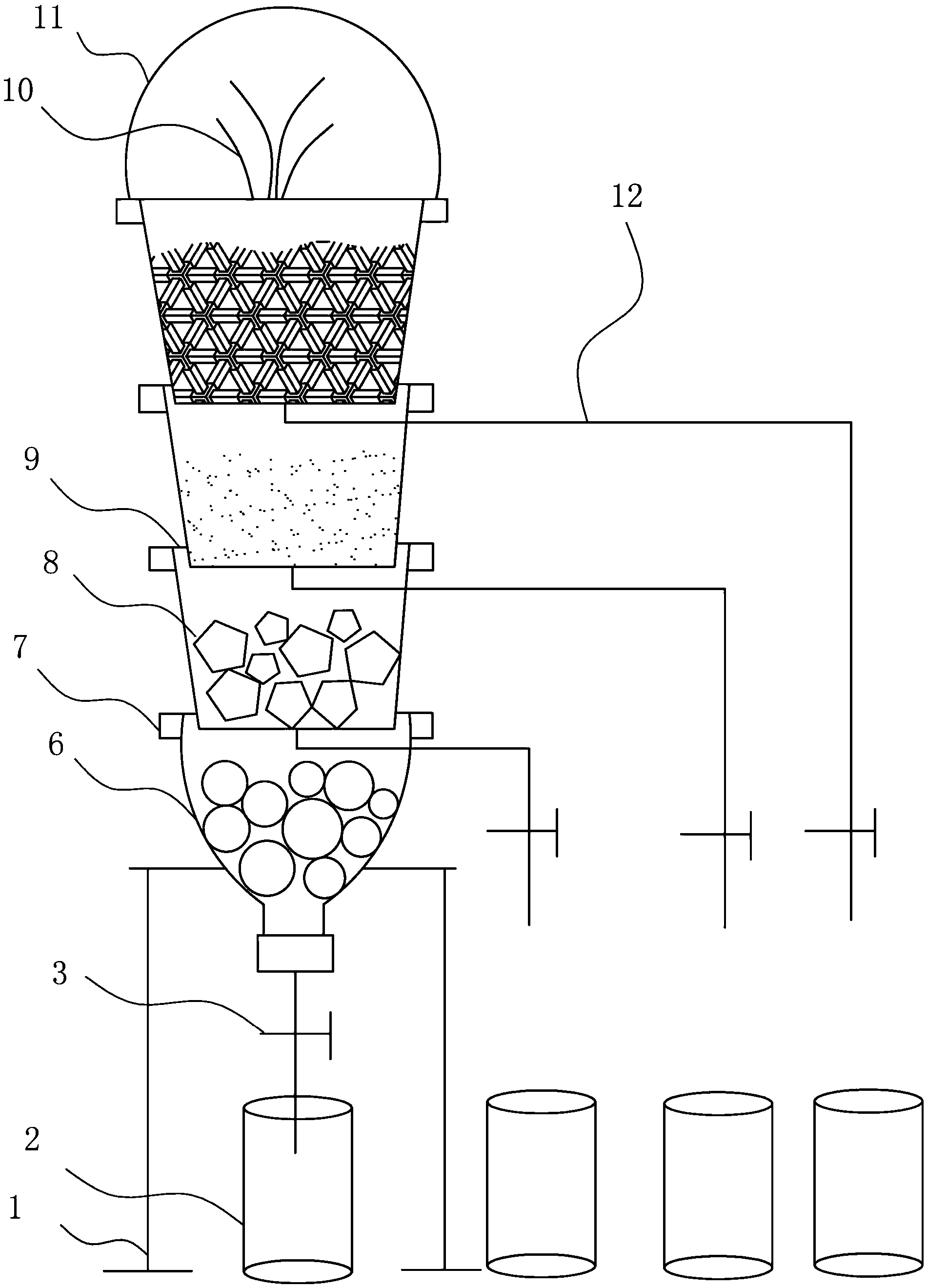 工作原理:首先,把污水倒入最高層的填料容器中,污水通過自重緩緩地往下流,經過各填料容器的過濾,填料容器底部都連接有出水導管,出水導管下端設有集水容器,出水導管上設有水閥,通過手動打開水閥就能夠輕易的得到相應填料容器對污水處理后的水體。