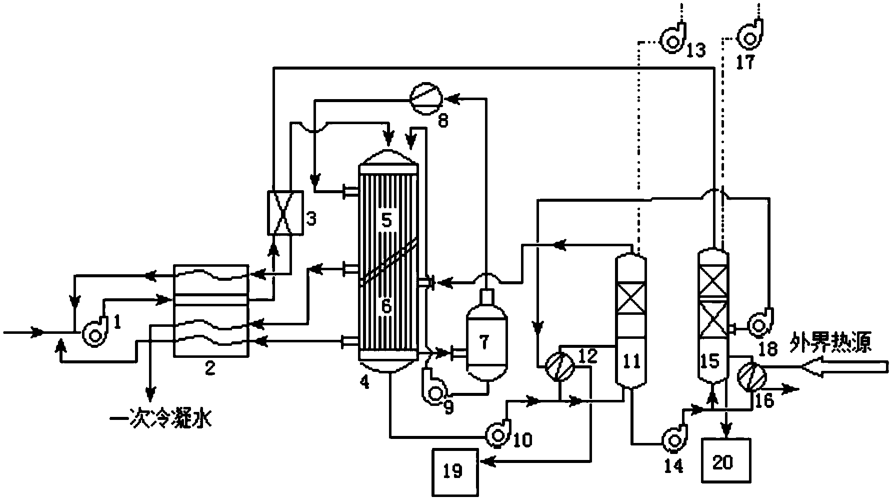 7.根據權利要求1所述的一種含有水溶性有機溶劑廢水的分離處理方法,其特征在于,所述的機械蒸汽再壓縮機產生的二次蒸汽,以及精餾或蒸餾過程中分離出的蒸汽與機械蒸汽再壓縮蒸發器中的含有水溶性有機溶劑廢水換熱后,與進入機械蒸汽壓縮蒸發器之前的含有水溶性有機溶劑廢水進行換熱。