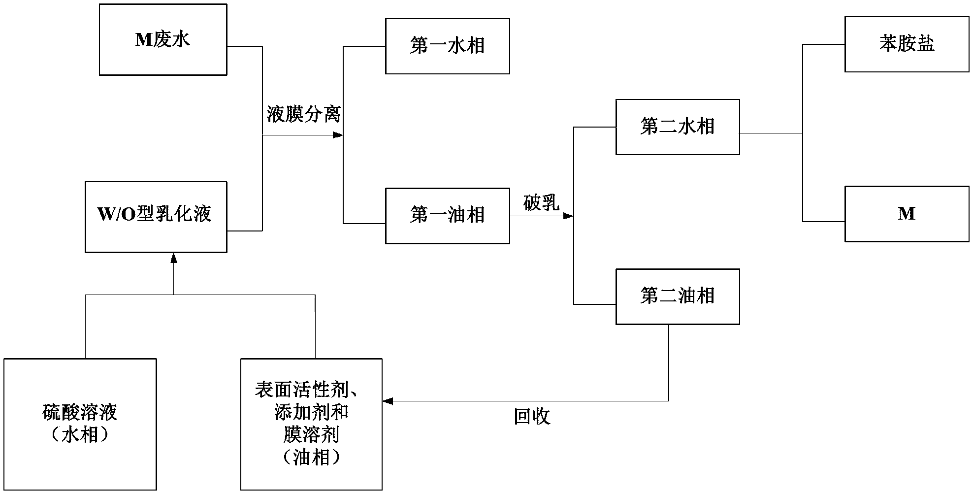 1.1)制備W/O型乳化液,所述W/O型乳化液的成分滿足能將M廢水中 的苯胺鹽與其它有機物分離;