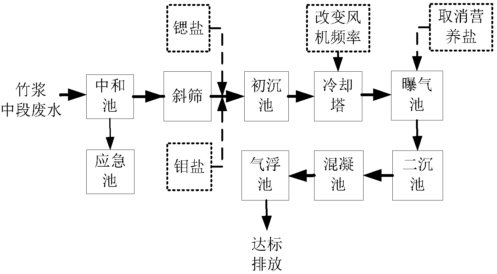 技術方案:傳統的竹漿廢水的處理方法,主要步驟包括:竹漿廢水經中和調 節至PH為弱堿性、篩濾去除大懸浮物、初沉去除細小纖維、冷卻水溫至適宜微 生物生長、曝氣提供微生物氧氣、二沉收集活性污泥、混凝至微小顆粒成大絮體、 氣浮去除大絮體,最后廢水達標GB3544-2008排放,本發明的技術方案的改進 之處在于,在廢水篩濾去除大懸浮物后,在初沉池前增添了微量元素,提高進入 曝氣池前被冷卻的廢水的溫度,同時在曝氣池內逐步取消營養鹽的加入。