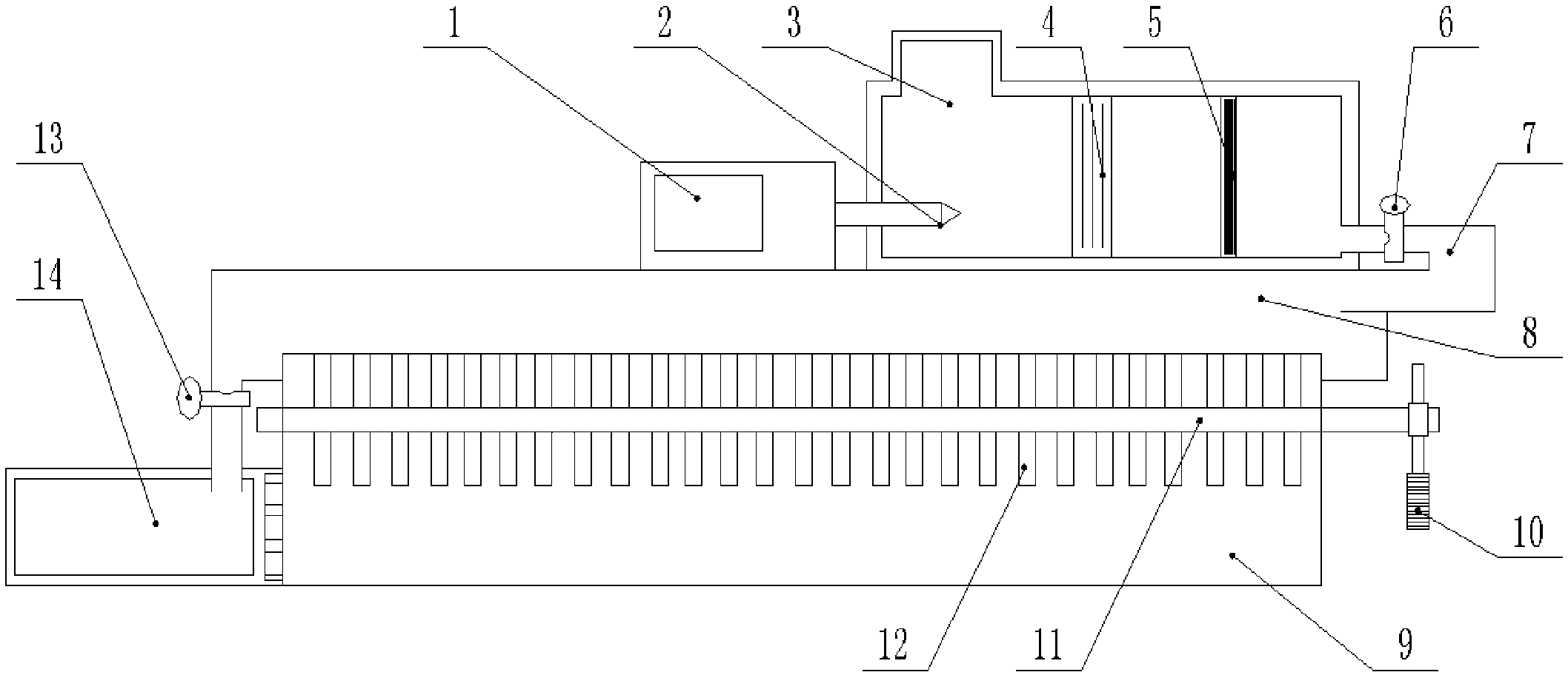 4.根據權利要求3所述的一種從污水中提取重金屬的裝置,其特征在于: 所述輸出閥門(13)輸入端連接著回收水箱(14)輸入端,所述回收水箱(14) 放置在活性炭箱(9)的左側。