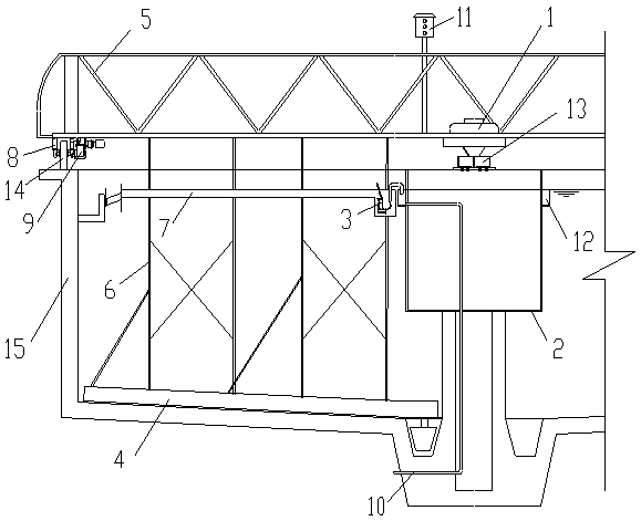 在二沉池內設置一個集渣斗,集渣斗帶有不小于1%的坡度,使集渣斗的頂部同二沉池內水面持平,或者是高出或低于水面不大于5mm,使集渣斗轉動,二沉池內的浮泥溢流進入集渣斗;因為浮泥的流動性較差,當浮泥難以溢流進入集渣斗時,適當降低集渣斗的高度,使一部分水流入集渣斗,增強浮泥流動性;將集渣斗內的浮泥通過潛污泵輸送至一個集渣槽,將集渣槽內的浮泥排出至污泥濃縮池或者回流至生化系統以補充流失的污泥;這樣既能夠及時有效的排出浮泥,當大量浮泥造成微生物流失時,也能夠補充生化系統微生物量。