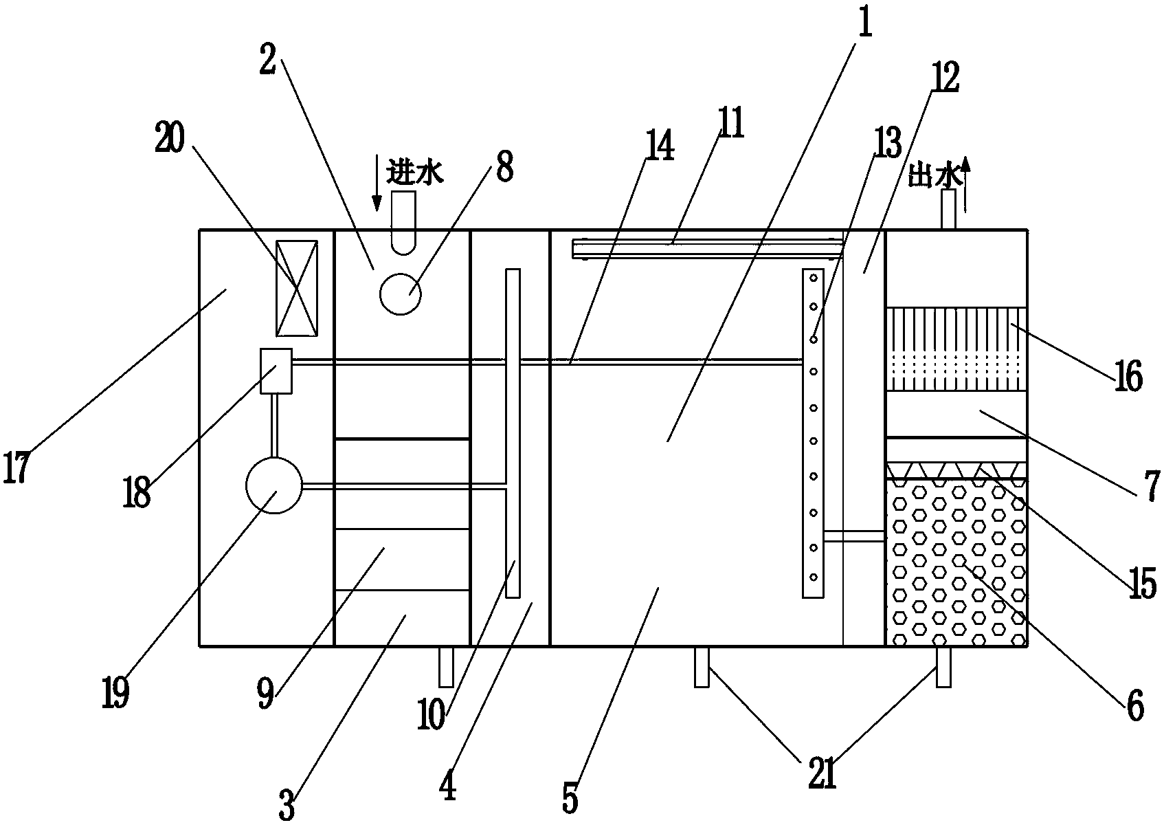 1.一種一體化景觀水處理裝置,包括池體(1),其特征在于:所述池體(1)內設有呈U型連接的電凝聚室(2)、混合室(3)、氣浮室(4)、分離室(5)、過濾室(6)和滅藻室(7),所述電凝聚室(2)內設有鋁電極(8),混合室(3)內斜置有擋板(9),氣浮室(4)內設有溶氣水釋放管(10),在分離室(5)的頂部設有刮渣機(11)和排渣槽(12),底部設有清液收集管(13)和溶氣水回流管(14),所述過濾室(6)內設有活性炭海綿填料,頂端設有出水堰(15),滅藻室(7)的頂端設有紫外燈(16);在池體(1)的一側設有控制室(17),所述控制室(17)內設有溶氣泵(18)和溶氣罐(19),溶氣罐(19)與氣浮室(4)內的溶氣水釋放管(10)連通,溶氣泵(18)與分離室(5)內的溶氣水回流管(14)連通。