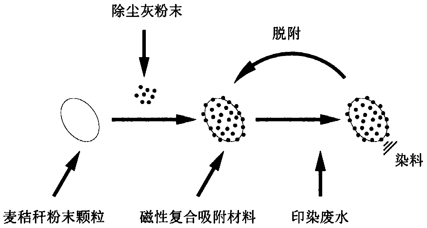 本發明提出了將麥秸稈粉末與煉鋼廠除塵灰交聯復合,制備的復合磁種不僅具有良好的磁性,而且通過麥秸稈粉末對煉鋼廠除塵灰改性,擴展了煉鋼廠除塵灰性能,通過對印染廢水的應用實例表明,該制備方法制備的廉價復合磁種不僅能夠將煉鋼廠除塵灰回收利用,既減輕了污染治理的負擔又節約了資源,而且以麥秸稈粉末對煉鋼廠除塵灰為主要原料,生產成本低,制備工藝簡單易操作,具有獨特良好的應用前景,并且制備的廉價復合磁種對廢水的處理效果好。