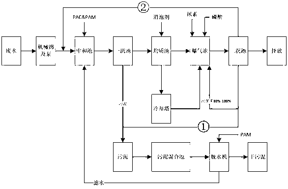 本發明上述第二個目的,將通過以下技術方案得以實現:銅版紙制造廢水好氧生化處理工藝,基于由機械篩、泵、中和池、初沉池、均質池、曝氣池、再沉池、污泥混合池和脫水機組成的系統實現,廢水經絮凝劑投放、兩次沉積處理排放,且沉積的污泥做脫水處理,濾水回送至中和池再利用,其特征在于:將再沉池底部的排泥口通過管道回連至中和池的入口,且通過管道所設的泵將再沉池沉積的剩余活性污泥回抽至中和池,與廢水一起進行絮凝沉降。