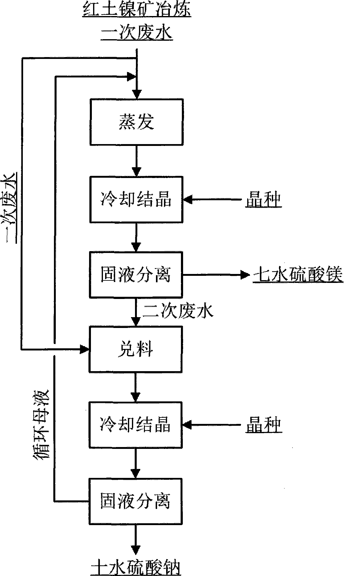 本發明涉及從紅土鎳礦冶煉產生的一次廢水中分離鈉鎂的方法,該方法首先將紅土礦鎳冶煉產生的硫酸鎂-硫酸鈉型一次廢水蒸發濃縮至鎂離子濃度達到3~3.5mol/L,然后將該溶液在七水硫酸鎂結晶器中冷卻至12~20℃進行結晶,過濾后得到七水硫酸鎂固體;過濾后的母液即二次廢水,向該母液中加入一次廢水兌料至溶液中的鎂離子濃度降至1.5~2mol/L,之后將溶液在十水硫酸鈉結晶器中進一步冷卻至-5~5℃進行結晶,過濾后得到十水硫酸鈉固體,分離十水硫酸鈉的母液返回與一次廢水混合進入下一個循環。本發明的方法工藝簡單,并從鎳冶煉廢水中分離出了可出售的化工產品,經濟性好;同時采用了母液循環的方式,工藝過程無廢液排放,環境友好。