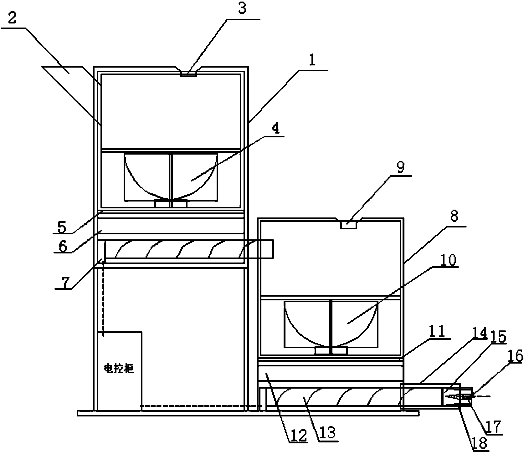 1.一種脫水污泥兩級快速干化機,其特征是由一級干化器、二級干化器和成型器三部分 組成,所述一級干化器由一級干化器殼體(1)、Ⅰ號進料口(2)、Ⅱ號進料口(3)、Ⅰ號攪 拌器(4)、Ⅰ號活動擋板(5)、Ⅰ號整流板(6)和Ⅰ號螺旋輸送機(7)組成,Ⅰ號進料口 (2)設(shè)置在一級干化器殼體(1)的側(cè)壁上部,Ⅱ號進料口(3)設(shè)置在一級干化器殼體(1) 的頂壁上,Ⅰ號攪拌器(4)設(shè)置在一級干化器殼體(1)內(nèi)的中上部并與Ⅰ號進料口(2)和 Ⅱ號進料口(3)相通,Ⅰ號活動擋板(5)設(shè)置在Ⅰ號攪拌器(4)的下方,Ⅰ號整流板(6) 設(shè)置在Ⅰ號活動擋板(5)的下方,Ⅰ號螺旋輸送機(7)設(shè)置在Ⅰ號整流板(6)的下方并與 Ⅰ號整流板(6)相通;所述二級干化器由二級干化器殼體(8)、Ⅲ號進料口(9)、Ⅱ號攪拌 器(10)、Ⅱ號活動擋板(11)、Ⅱ號整流板(12)和Ⅱ號螺旋輸送機(13)組成,Ⅲ號進料 口(9)設(shè)置在二級干化器殼體(8)的頂壁上,Ⅱ號攪拌器(10)設(shè)置在二級干化器殼體(8) 內(nèi)中上部并與Ⅲ號進料口(9)相通,Ⅱ號活動擋板(11)設(shè)置在Ⅱ號攪拌器(10)的下方, Ⅱ號整流板(12)設(shè)置在Ⅱ號活動擋板(11)的下方,Ⅱ號螺旋輸送機(13)設(shè)置在Ⅱ號整 流板(12)的下方;所述成型器由套筒(14)、成型筒(15)、刀具(16)和電機(17)組成, 成型筒(15)設(shè)置在套筒(14)內(nèi),在成型筒(15)上設(shè)有四個成型孔道(18),刀具(16) 設(shè)置在成型筒(15)外部且刀具(16)的一端與電機(17)的輸出軸相連接,所述Ⅰ號螺旋 輸送機(7)的輸出端延伸到二級干化器殼體(8)內(nèi)部位于Ⅰ號攪拌器(4)的上方,Ⅱ號螺 旋輸送機(13)的輸出端延伸到套筒(14)內(nèi)。