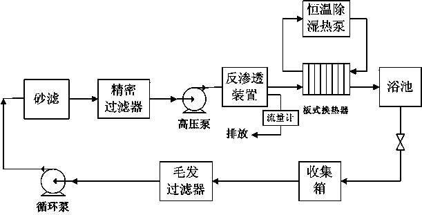 為實現上述目的,本實用新型采用以下技術方案:本系統主要由通過管道依次連接的收集箱、毛發過濾器、循環泵、砂濾、精密過濾器、高壓泵、反滲透裝置和板式換熱器組成,浴池產生的廢水進入到收集箱內,反滲透的出水通過板式換熱器加熱后排入到浴池中。