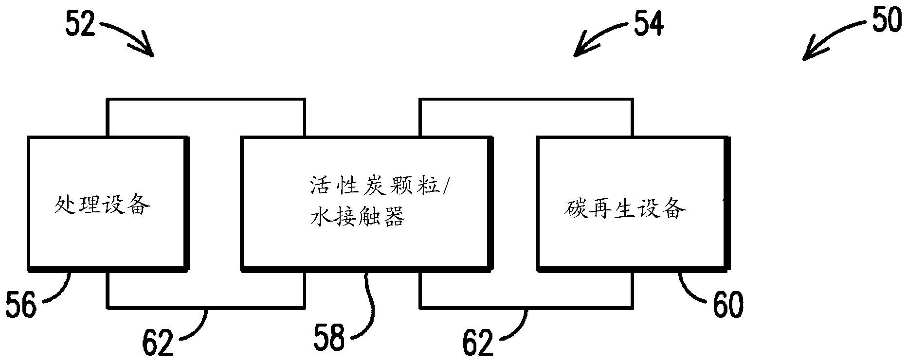 2.權利要求1的系統,其中所述碳再生回路包括相互連接的泵、加熱器以及壓縮含氧氣體源,從而在所述活性碳顆粒/水接觸器內,于濕空氣再生失效的活性碳顆粒的有效條件下,循環經加熱的含氧水通過所述活性碳顆粒/水接觸器。