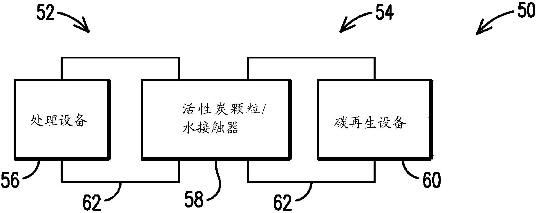 2.權利要求1的系統,其中所述碳再生回路包括相互連接的泵、加熱 器以及壓縮含氧氣體源,從而在所述活性炭顆粒/水接觸器內,于濕空氣再 生失效的活性炭顆粒的有效條件下,循環經加熱的含氧水通過所述活性炭顆 粒/水接觸器。