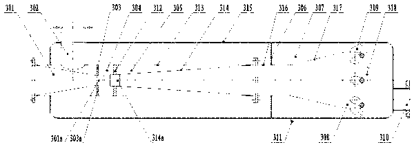 1.一種超臨界溶氣空化設(shè)備,它包括一個(gè)由收縮噴管 (301)和空氣吸入管(302)構(gòu)成的射流空化發(fā)生器,其特征在于:它還包括一個(gè)一次擴(kuò)散管(314) 和一個(gè)靶式渦流空化發(fā)生器,所述射流空化發(fā)生器與一次擴(kuò)散管(314)采用主體內(nèi)套(313)連接在一起,主體內(nèi)套(313)和靶式渦流空化發(fā)生器設(shè)置在主體外套(315)中;所述收縮噴管 (301)設(shè)有一個(gè)收縮噴管喉管(301a),收縮噴管喉管(301a) 與主體內(nèi)套(313)之間設(shè)有一個(gè)帶孔的進(jìn)氣調(diào)節(jié)板(303), 所述一次擴(kuò)散管(314)設(shè)有一個(gè)一次擴(kuò)散管喉管(314a),一次擴(kuò)散管喉管(314a) 與主體內(nèi)套(313)之間設(shè)有一個(gè)隔板(312),在進(jìn)氣調(diào)節(jié)板(303)與隔板(312)之間為溶氣空化腔(304);所述靶式渦流空化發(fā)生器采用連接管(316)把一次擴(kuò)散管(314)與二次擴(kuò)散管(317)連接在一起,二次擴(kuò)散管(317)連接一個(gè)由靶板(318)封閉的集水套筒(308),集水套筒(308)的一周設(shè)有空化噴嘴(309),鑲焊隔板(306)設(shè)置在連接管(316)與主體外套(315)之間;汚泥高速流過收縮噴管 (301)時(shí),從空氣吸入管(302)引射空氣進(jìn)入溶氣空化腔(304)中與汚泥混合后依次進(jìn)入一次擴(kuò)散管(314)及二次擴(kuò)散管(317),然后從空化噴嘴(309)噴入氧化反應(yīng)釜(307)中,最后經(jīng)溶氣空化處理后的污泥從污泥輸出管(310)排出。