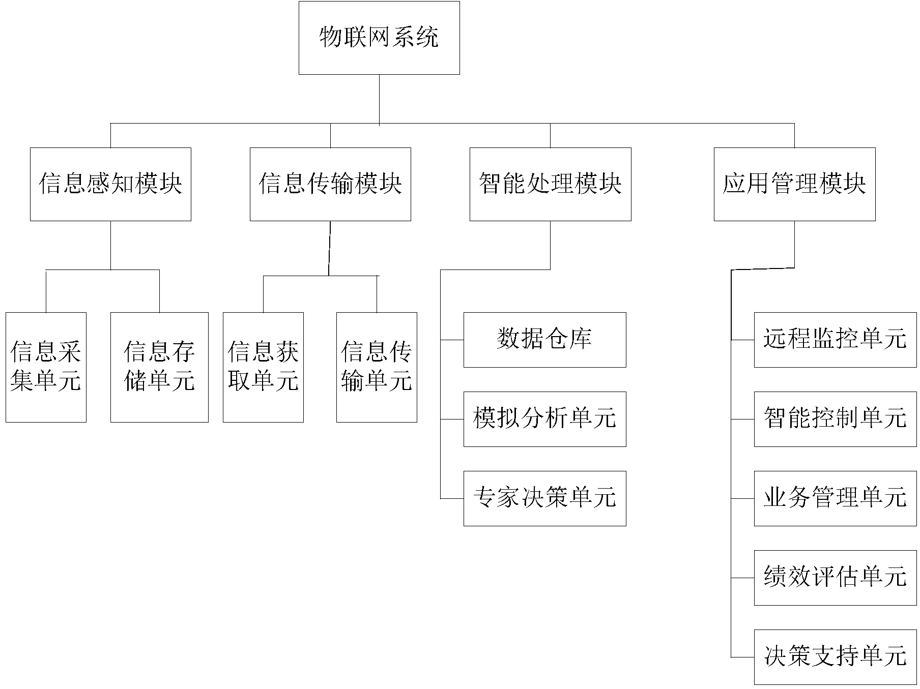 所述智能處理模塊包括數(shù)據(jù)倉(cāng)庫(kù)、模擬分析單元和專家決策單元,其 中,所述數(shù)據(jù)倉(cāng)庫(kù)用于存儲(chǔ)從所述信息感知模塊獲取的各種信息,為所述 應(yīng)用分析模塊提供決策數(shù)據(jù)支持,所述模擬分析單元用于對(duì)獲取的各種污 水處理信息進(jìn)行智能分析和處理,所述專家決策單元用于對(duì)系統(tǒng)的運(yùn)行環(huán) 境進(jìn)行識(shí)別、診斷、預(yù)報(bào)警并提供解決問(wèn)題的策略和方法。