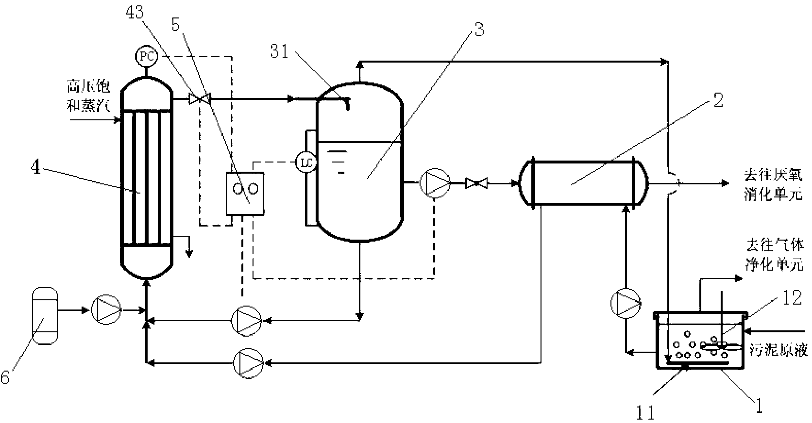 3)對水解后的污泥進行氣液分離,氣液分離產(chǎn)生的氣體返回至步驟1)中對污泥原 液進行一級加熱,氣液分離產(chǎn)生的污泥液,一部分對污泥原液進行二級加熱;氣液分離產(chǎn) 生的另一部分污泥返回至步驟2)中再次進行水解反應。