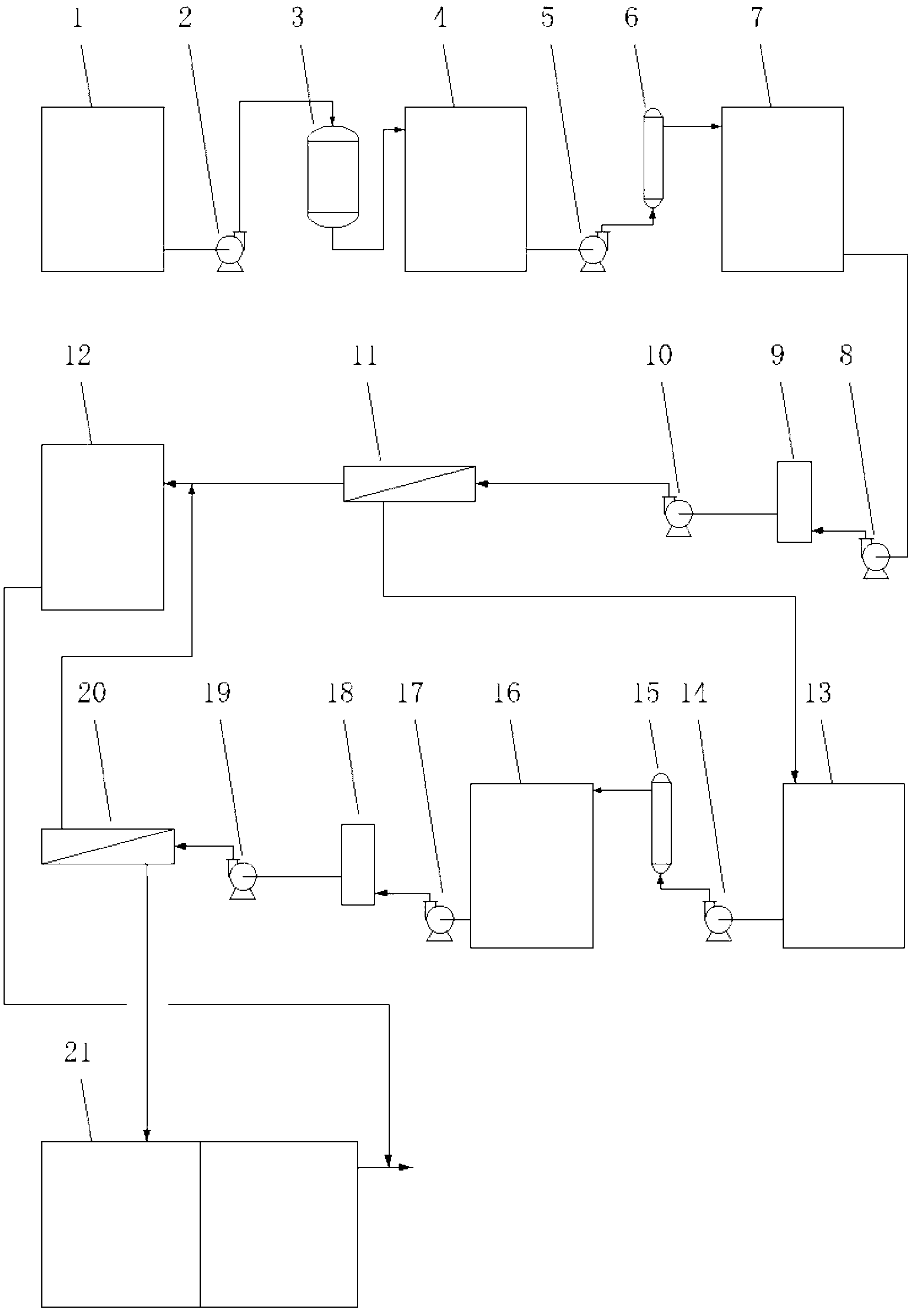 針對現有技術中的不足,本發明響應國家更加嚴格的排放要求和節能減排的 號召,為農化企業提供了一種基于超濾(UF)-反滲透(RO)技術的農化廢水磷達標處理方法。通過該發明方法處理中低濃度含磷廢水,經過有針對性的預處理工藝,解決了RO系統高回收率下污堵的問題,使RO系統穩定運行在回收率≥90%的狀態下,對RO濃水進行氧化除磷,濃水再同產水混合,實現整體的穩定達標。對濃水進行除磷可以提高藥劑的捕獲效率,減少藥劑的使用量,雖然整體工藝線較長,但系統自動化程度高,管理維護簡單,且從根本上解決了無法達標排放的問題。