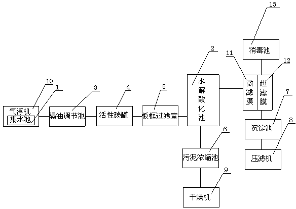 1.食品工業廢水處理系統,包括集水池和水解酸化池,其特征在于:所述集水池和水解酸化池之間依次設置有隔油調節池和活性碳罐,所述活性碳罐再與板框過濾室連通,所述水解酸化池底部與污泥濃縮池連接,所述水解酸化池上部與微濾超濾集成系統連接,所述微濾超濾集成系統再與沉淀池連接,所述沉淀池再與壓濾機連接,所述污泥濃縮池與干燥機連接。