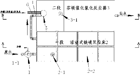 所述活動式鐵碳反應床2的前段安裝有與管道混合器的加藥泵聯動、能夠實時監測pH值的一段數顯pH檢測計2-1;