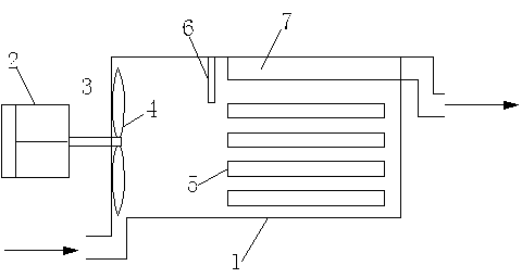 1.一種用于含油壓艙水處理的一體化旋流消毒裝置,其特征在于;由主體裝置(1)、電機(jī)(2)、轉(zhuǎn)軸(3)、葉輪(4)、紫外線燈管(5)、隔油板(6),出水渠(7)組成旋流裝置、紫外線裝置和隔油裝置,主體裝置(1)為長(zhǎng)方形防腐碳鋼結(jié)構(gòu),所述電機(jī)(2)經(jīng)由轉(zhuǎn)軸(3)與主體裝置(1 )內(nèi)的修改修改葉輪(4)連接,電機(jī)(2)驅(qū)動(dòng)葉輪(4)轉(zhuǎn)動(dòng),水流由主體裝置(1)進(jìn)口進(jìn)入,在葉輪(4)旋轉(zhuǎn)下產(chǎn)生旋流,經(jīng)過(guò)主體裝置(1)上的紫外線燈管(5)照射后,從出水渠(7)流出,旋流出的油質(zhì)經(jīng)由固定在主體裝置(1)上的隔油板(6)回流至船艙中。