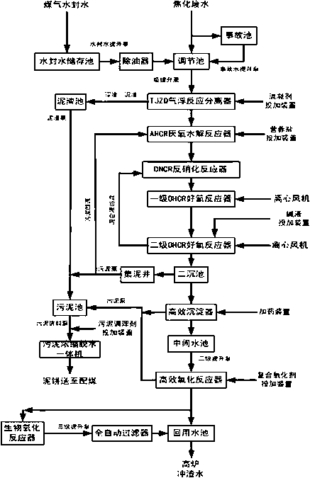 6.一種高毒性焦化酚氰廢水處理回用方法,廢水泵送至調節池,進行機械混合攪拌均衡水質,再由一級提升泵抽送至TJZQ氣浮反應分離器;在TJZQ氣浮反應分離器去除廢水中的油類污染物及懸浮雜質,降低廢水COD值,所述的TJZQ氣浮反應分離器分反應區、接觸區、分離區、清水區及泥渣區,在反應區內投加混凝劑和助凝劑,在分離區,浮渣和泥渣均自流進入泥渣區,清水則自流進入清水區,出水自流入AHCR厭氧水解反應器;廢水經AHCR厭氧水解反應器將大分子有機物及難降解的有機物分解為小分子有機物及易降解的有機物,同時提高生產廢水的BOD5/COD值,在AHCR厭氧水解反應器內懸掛安裝系列疊片展開式蜂窩狀微生物載體,對AHCR厭氧水解反應器進行保溫,出水自流進入DNCR反硝化反應器;在DNCR反硝化反應器中,通過反硝化菌將二級OHCR好氧反應器混合液回流帶來的硝酸鹽、亞硝酸鹽轉化為氮氣,以去除總氮,并補充一半堿度,使廢水達到中性,出水自流進入一級OHCR好氧反應器;在一級OHCR好氧反應器中,前端采用多點配水,后端采用推流式曝氣,該一級OHCR好氧反應器連接二級OHCR好氧反應器,在一級OHCR好氧反應器中,通過微生物新陳代謝對廢水中的有機碳化物進行充分降解,然后再經二級OHCR好氧反應器中硝化菌將廢水中的氨氮轉化為硝酸鹽氮和亞硝酸鹽氮,在二級OHCR反應器中需自動投加堿液,一級OHCR好氧反應器、二級OHCR好氧反應器均采用微孔曝氣器和離心風機進行供氧,混合液回流至DNCR反硝化反應器進行反硝化反應;二級OHCR好氧反應器出水自流進入二沉池,進行泥水分離,二沉池采用輻流式沉淀池,二沉池底泥通過污泥回流泵回流至DNCR反硝化反應器;二沉池出水重力流入高效沉淀器,在高效沉淀器中,分別設置反應區、接觸區、分離區、清水區及泥渣區,在反應區中,經加藥泵自動投加混凝劑,并設置機械攪拌,在分離區,浮渣和泥渣均自流進入泥渣區,清水則自流進入中間水池;中間水池出水由二級提升泵抽送至高效氧化反應器,以氣相連續的方式進行接觸傳質,將廢水中COD轉化為BOD5,并對水體充氧,該高效氧化反應器出水自流入生物氧化反應器;生物氧化反應器出水自流入全自動過濾器,全自動過濾器的出水進入回用水池;TJZQ氣浮反應分離器、二沉池、高效沉淀器、高效氧化反應器排出的泥渣分別排至污泥池進行濃縮;污泥在污泥池經機械濃縮后,由污泥進料泵抽送至污泥濃縮脫水一體機進行污泥脫水,同時投加污泥調理劑以增強脫水效率,脫水后的干泥可送至配煤,進行焦爐焚燒。