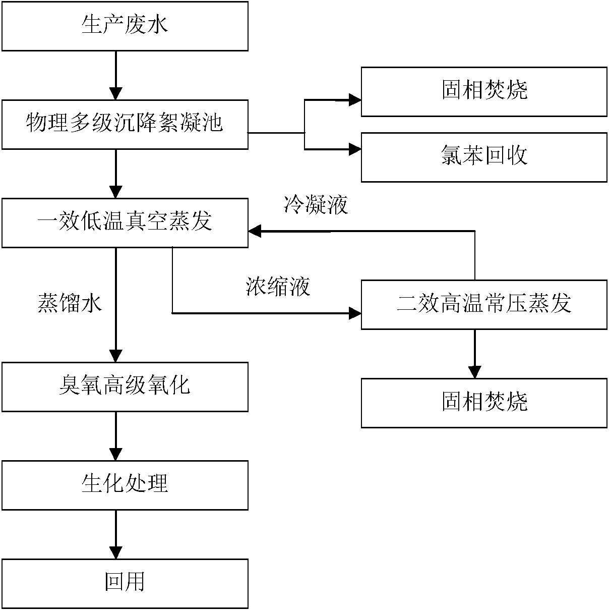 (3)二效高溫常壓蒸發(fā):將步驟(2)排出的濃縮液送入二效低溫真空蒸發(fā)器,蒸發(fā)器內(nèi)的溫度為105℃至120℃,蒸發(fā)器內(nèi)的液位控制在30-40%,排出冷凝液經(jīng)絮凝劑處理后,再經(jīng)過濾器過濾,上清液送回一效低溫真空蒸發(fā)器循環(huán)處理,排出的固體廢棄物進(jìn)行焚燒處理;