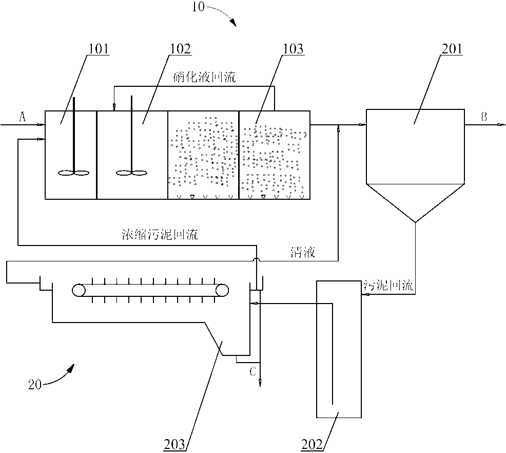上述技術方案的處理系統,其單位面積污水處理能力有限,造成設施和設備的浪費;其處理工藝中采用二沉池進行泥水分離,固液分離效率低,污泥濃縮效果差,回流到厭氧池的活性污泥濃度只能維持在2000mg/L~3000mg/L,使得生化反應池(即第一主體生物段)內的微生物難以維持較高的濃度,導致污水處理廠處理能力始終處于較低水平。因此,設計開發更加穩定高效的回流污泥濃縮系統及其工藝是迫切需要解決的技術難題。