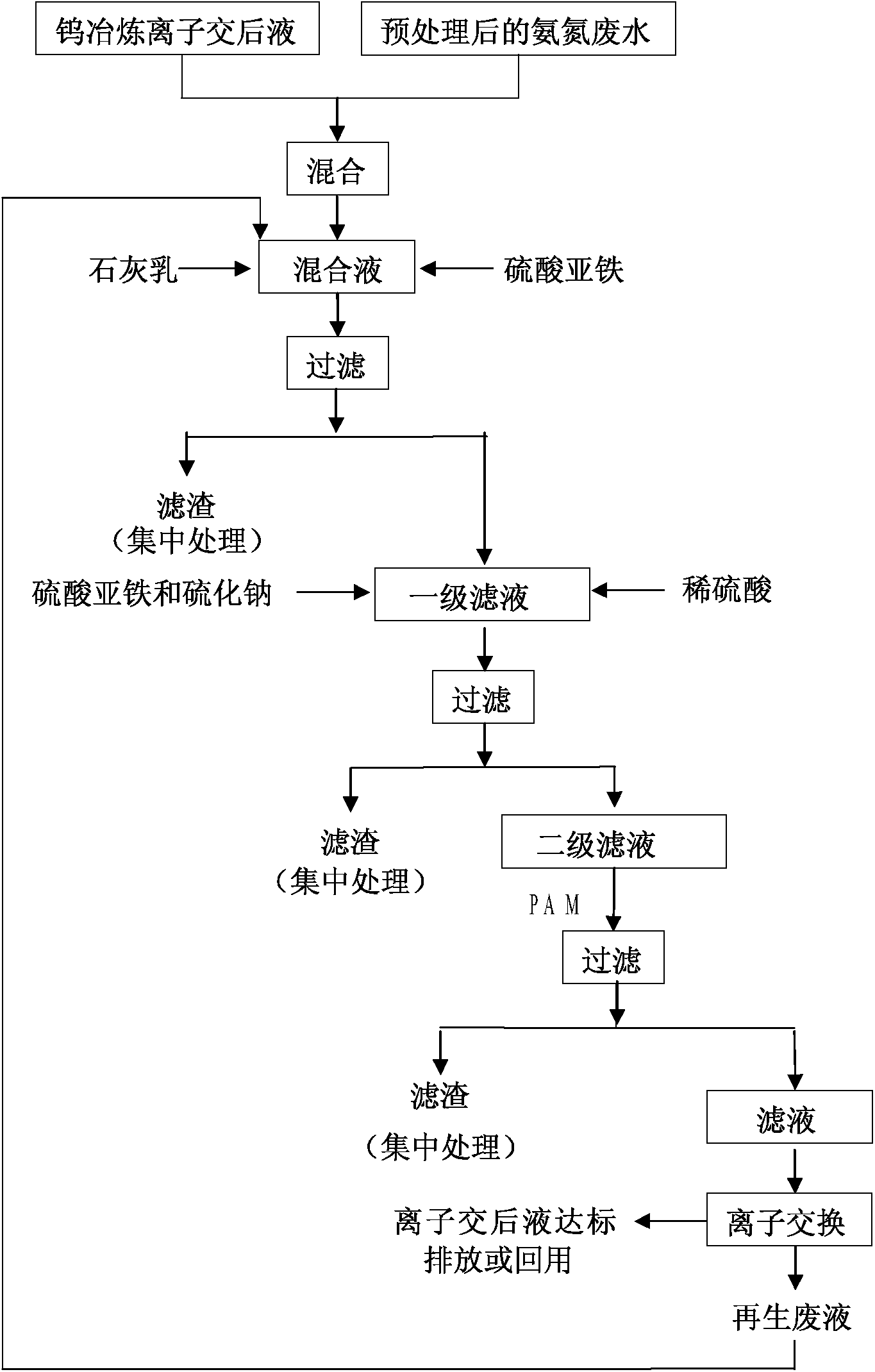 本發(fā)明的有益效果是本發(fā)明方法采用充分利用了鎢冶煉過程中產(chǎn)生的離 子交后液和氨氮廢水進行化學沉降處理,只是用少量低成本的普通試劑即可 以達到深度凈化水質(zhì)的目的,并且本發(fā)明可以使鎢冶煉廢水經(jīng)過深度凈化后 砷的濃度低于0.025mg/L,除砷效率提高50%,凈水效果好,經(jīng)深度凈化之 后的鎢冶煉廢水可直接排放或回用,節(jié)能環(huán)保。總之,本發(fā)明方法采用兩級 化學沉淀和離子交換工藝作為廢水處理的主體工藝,步驟簡單、設(shè)備投資少、 易監(jiān)控、易于操作、處理成本低、無二次污染、節(jié)能環(huán)保。