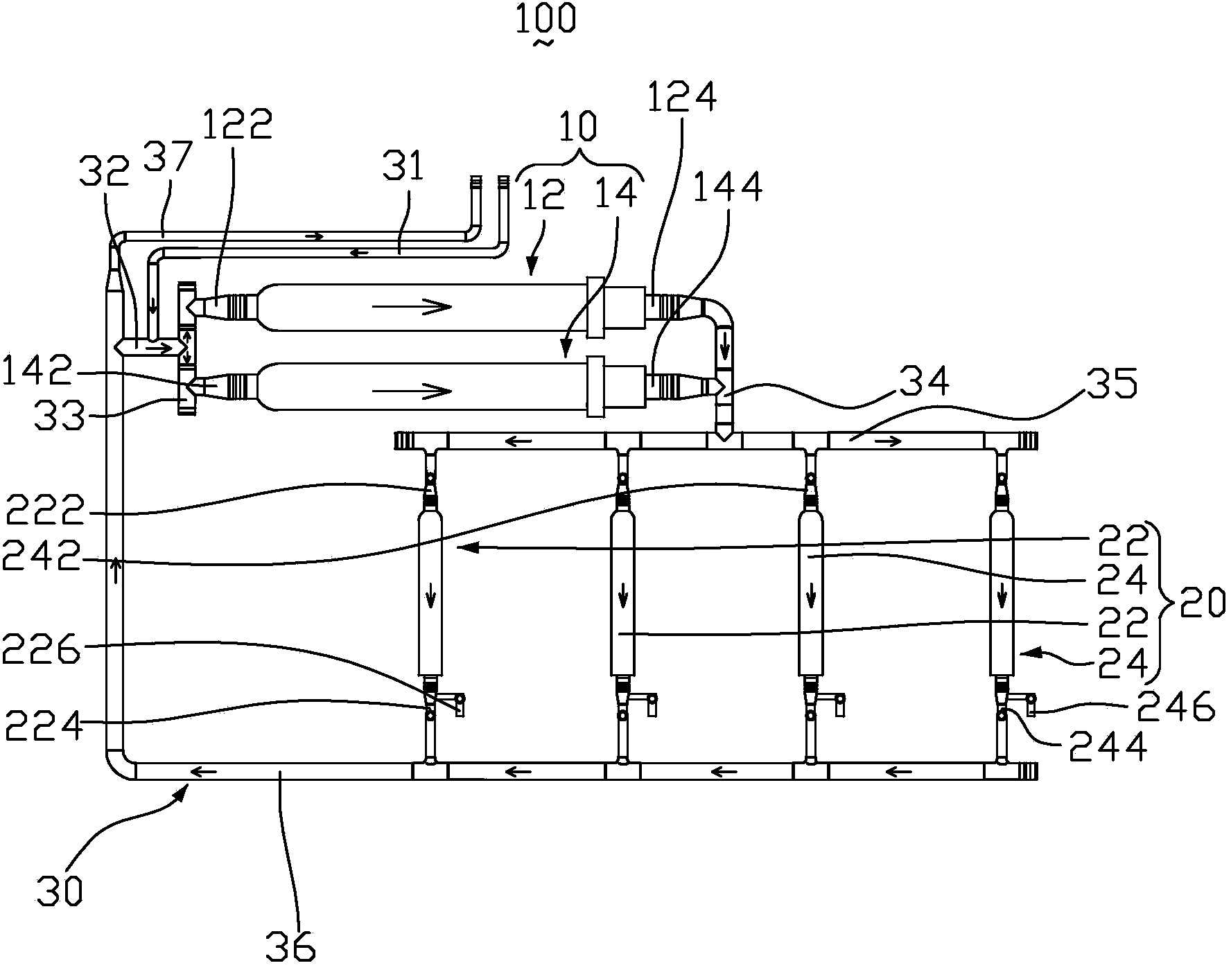 1.一種滲濾液處理車在線泵組的管網結構(100),其特征在于:包括多個在線泵(10)、 多個膜柱(20)、以及管網(30),所述管網(30)包括原水進水管(31)、濃縮液循環管(32)、 在線泵進水管(33)、在線泵出水管(34)、膜柱進水管(35)、膜柱濃縮液出水管(36)、及 濃縮液排放管(37),所述原水進水管(31)用于引入原水至所述多個在線泵(10)的進口(122、 142)處,所述濃縮液循環管(32)連接在所述膜柱濃縮液出水管(36)與所述在線泵進水管 (33)之間,所述多個在線泵(10)并聯設置在所述在線泵進水管(33)與所述在線泵出水 管(34)之間,所述在線泵出水管(34)連接至所述膜柱進水管(35)上,所述多個膜柱(20) 并聯設置在所述膜柱進水管(35)與所述膜柱濃縮液出水管(36)之間,所述濃縮液排放管 (37)連接至所述膜柱濃縮液出水管(36)上。