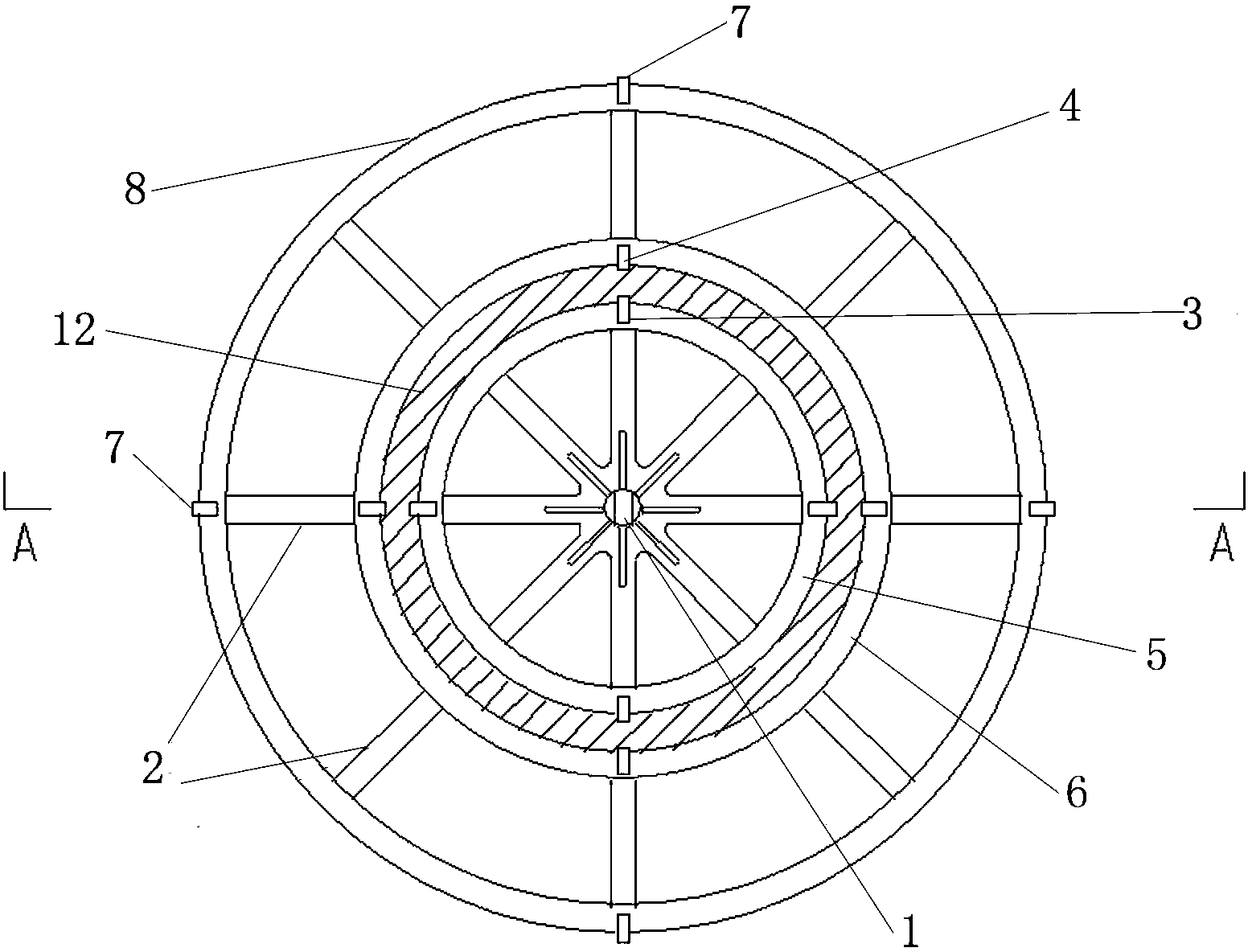 3.如權(quán)利要求1或2所述的適用于電化學(xué)水處理設(shè)備的除垢裝置,其特征在于,所述支撐板(2)之間還設(shè)有底部連接圈(12);所述底部連接圈(12)包括連接在支撐板(2)的另一端之間的外部連接圈以及連接在支撐板(2)非端部之間的中部連接圈;中部連接圈包括連接在相鄰支撐板(2)之間與每個(gè)第一刮刀對(duì)應(yīng)的位置處的多個(gè)圓弧狀連接板,對(duì)應(yīng)于同一組第一刮刀的多個(gè)圓弧狀連接板組成一個(gè)中部連接圈。