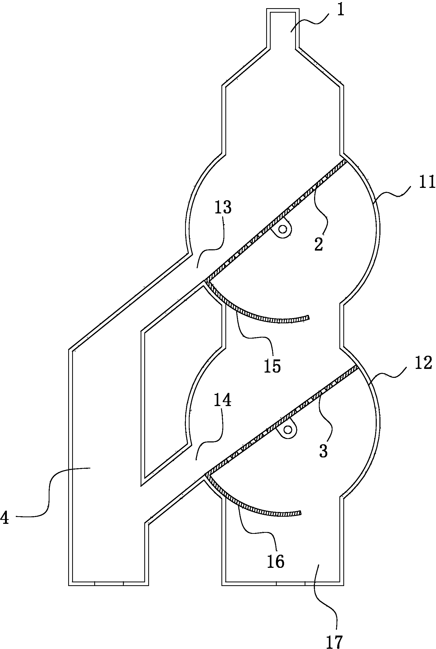 本實用新型的有益效果:本實用新型包括與所述第一球形壁和第二球形壁同心 且相切的第一過濾翻板和第二過濾翻板,所述第一球形壁和第二球形壁上設 置有第一污泥出口和第二污泥出口,第一過濾翻板和第二過濾翻板的一側緊 固有第一出口擋板和第二出口擋板,當所述第一過濾翻板和第二過濾翻板翻 轉至水平位置時,所述第一出口擋板和第二出口擋板將所述第一污泥出口和 第二污泥出口堵嚴,此時對流入筒體內的污水進行過濾;當所述第一過濾翻 板和第二過濾翻板翻轉至所述第一污泥出口和第二污泥出口時,所述第一污 泥出口和第二污泥出口處的第一出口擋板和第二出口擋板分別打開,此時污 泥排出。本實用新型結構簡單,固液分離方便快捷。