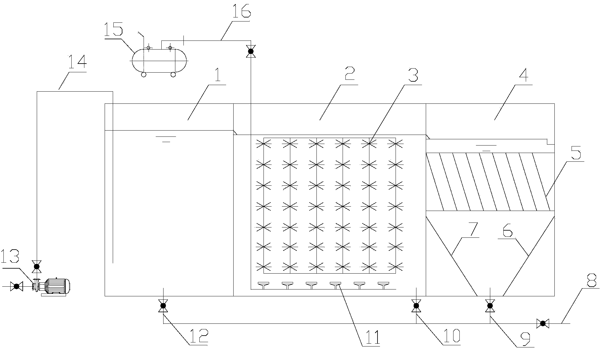 進一步地,所述接觸氧化池上設有曝氣裝置,所述曝氣裝置包括依次連接 的鼓風機、空氣管道和曝氣盤,所述鼓風機設于所述接觸氧化池外部,所述曝 氣盤設于所述接觸氧化池的底部。