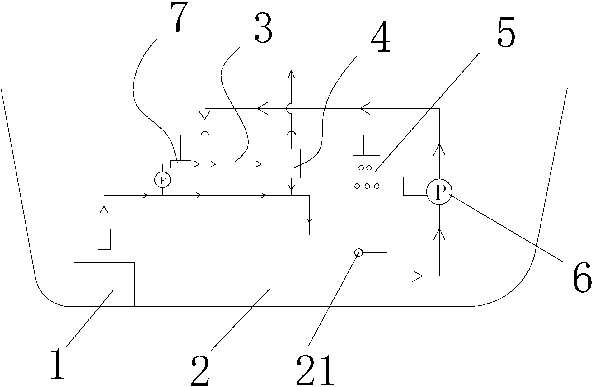 1.船舶壓載水處理裝置,其特征是:包括船體,所述船體內設置有進水箱 (1)和壓載水箱(2),所述的壓載水箱(2)內設置有用于檢測次氯酸鈉濃度 的余氯分析器(21),所述的壓載水箱(2)與進水箱(1)之間通過主進管連通, 所述主進管的管路上設置有自動反清洗過濾器,所述位于自動反清洗過濾器與 壓載水箱(2)之間的主進管的管路上設置有支路管道,所述的支路管道的管路 上設置有電解槽(3)和除氫罐(4),所述的壓載水箱(2)與支路管道之間連 通有回流管,所述回流管的出口端連接在電解槽(3)進口處的支路管道上,所 述回流管上設置有回流泵(6);
