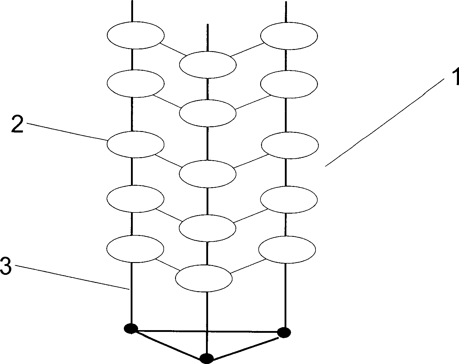 1.一種用于污水處理的竹炭纖維填料,是由若干個填料處理單元(1)構成,其特征在于,所述的填料處理單元(1)是由多個層級小型處理單元(2)和固定桿(3)組成,所述的層級小型處理單元(2)固定在固定桿(3)上,所述的小型處理單元(2)是由竹絲圈(21)和若干個竹炭纖維片(22)構成,所述竹絲圈(21)設置在中間,所述若干個竹炭纖維片(22)設置在竹絲圈(21)外周。