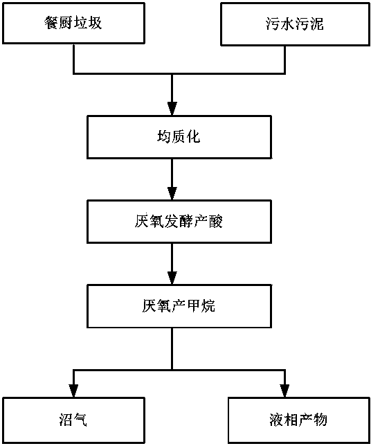 3、本發(fā)明采用污水污泥和餐廚垃圾共消化的方法,將產(chǎn)酸相與產(chǎn)甲烷相分離開,分別為產(chǎn)酸菌和產(chǎn)甲烷菌創(chuàng)造最佳生存環(huán)境。產(chǎn)酸菌世代周期短,適宜在酸性條件下生存代謝;而產(chǎn)甲烷菌世代周期較長,適宜在pH值6.8~7.4范圍內(nèi)生存代謝。把產(chǎn)酸相和產(chǎn)甲烷相分離,可以分別為產(chǎn)酸菌和產(chǎn)甲烷菌創(chuàng)造最佳的生存環(huán)境,提高系統(tǒng)運(yùn)行穩(wěn)定性、有機(jī)物去除效果和產(chǎn)氣效率。
