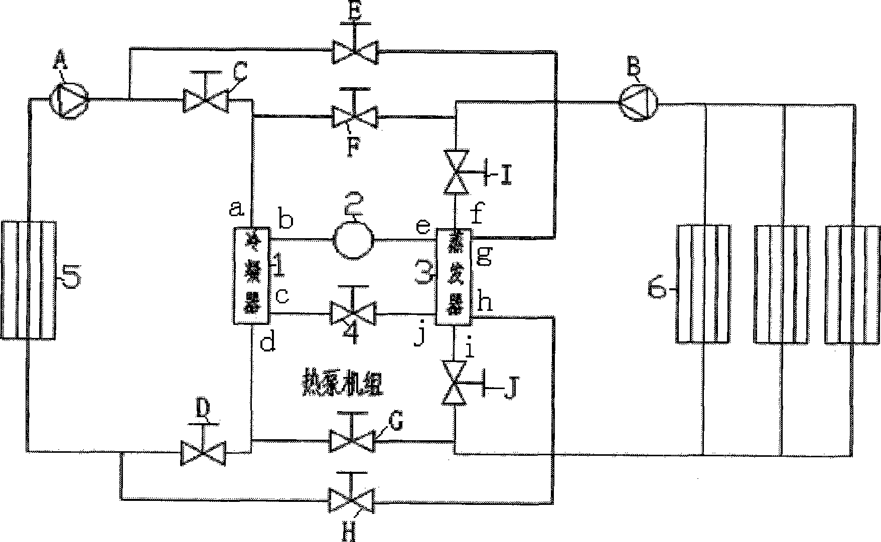整個(gè)系統(tǒng)通過管路和閥門連接,冷凝器1的下端出口d經(jīng)閥門D 與毛細(xì)管網(wǎng)前端換熱器5一端連接,毛細(xì)管網(wǎng)前端換熱器5的另一端 通過循環(huán)水泵A及閥門C與冷凝器1的上端入口a相連,冷凝器1 的b端通過壓縮機(jī)2與蒸發(fā)器3的e端連接,冷凝器1的c端通過節(jié) 流閥4與蒸發(fā)器3的j端連接,蒸發(fā)器3的i端經(jīng)閥門J連接毛細(xì)管 網(wǎng)末端換熱系統(tǒng)6一端,毛細(xì)管網(wǎng)末端換熱系統(tǒng)6另一端經(jīng)循環(huán)水泵 B及閥門I連接蒸發(fā)器3的f端,閥門E一端連接蒸發(fā)器3的g端另 一端連接循環(huán)水泵A和閥門C之間管路,閥門F一端連接閥門C和 冷凝器1的a端之間管路,另一端連接循環(huán)水泵B及閥門I之間管路, 閥門H一端連接蒸發(fā)器3的h端,另一端連接毛細(xì)管網(wǎng)前端換熱器5 和閥門D之間管路,閥門G一端連接閥門D和冷凝器1的c端之間 管路,另一端連接閥門J和毛細(xì)管網(wǎng)末端換熱系統(tǒng)6之間管路。