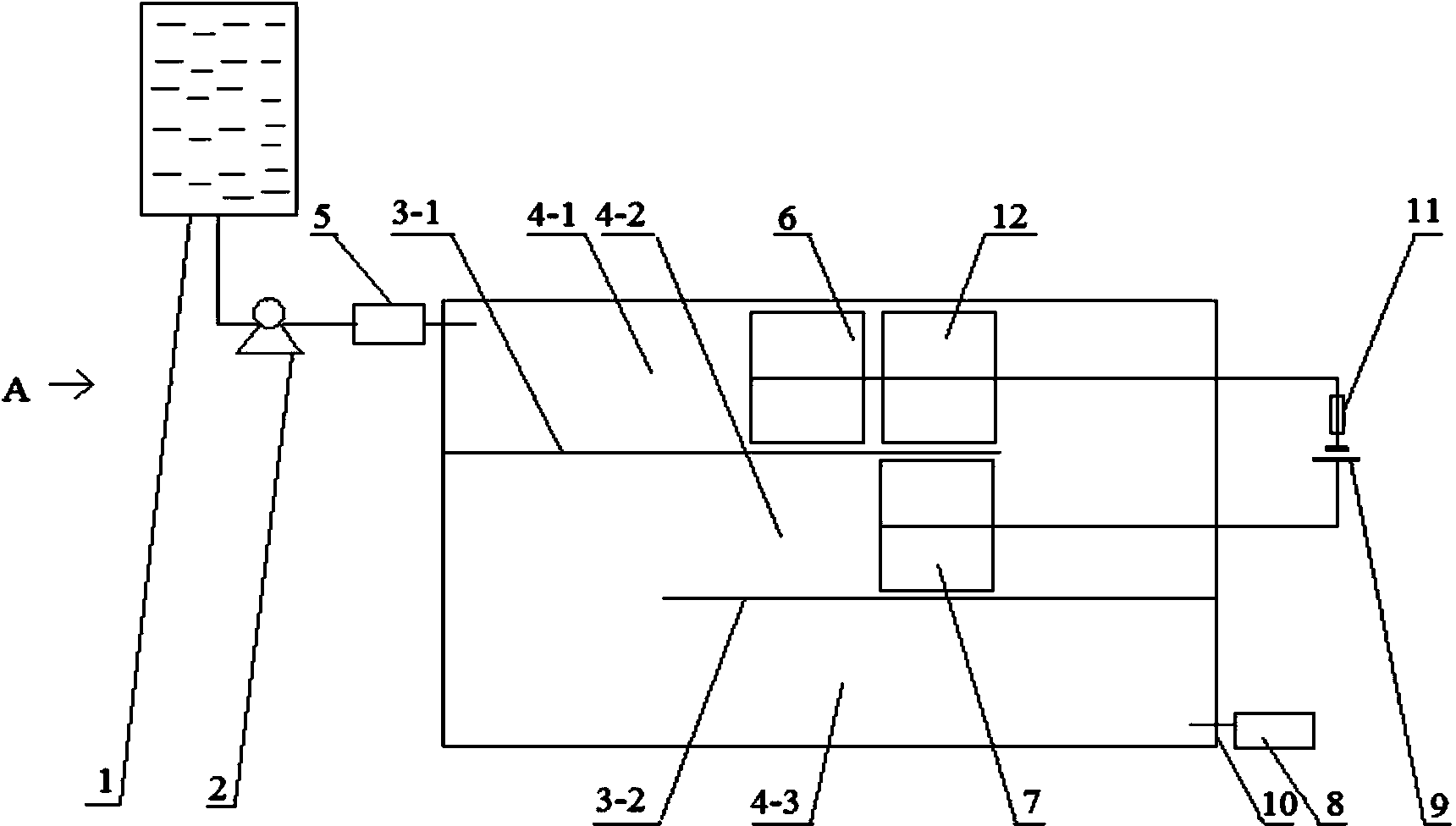 一種微生物強(qiáng)化型廊道推流式廢水處理生物電化學(xué)裝置,該裝置由進(jìn)水箱、進(jìn)水泵、污水處理池和出水口組成;