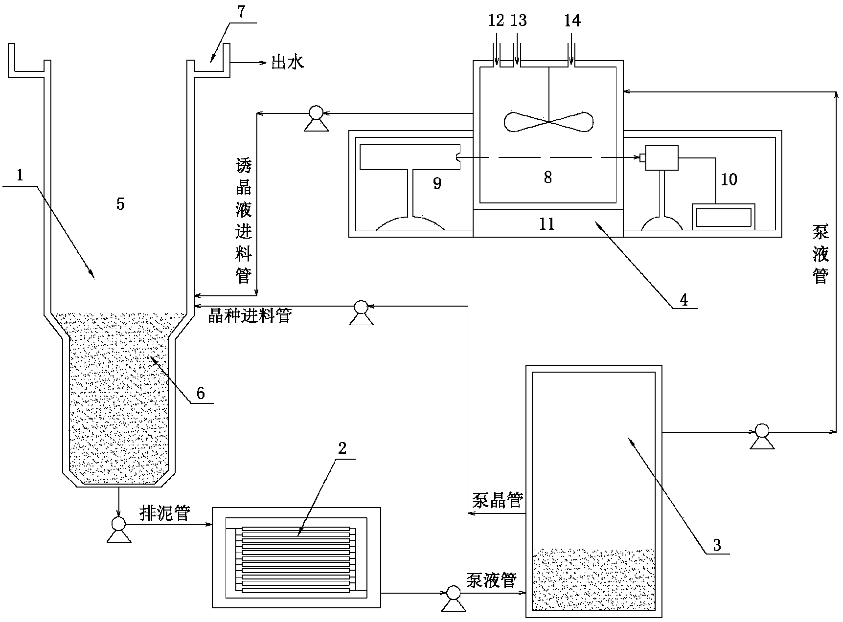 所述集晶罐的排泥管與所述過濾器相連通;所述過濾器的液體出口與所述飽和液 緩沖槽相連通;所述飽和液緩沖槽的固體出口與所述養(yǎng)晶罐相連通,所述飽和液緩沖 槽的液體出口與所述誘晶液槽相連通;
