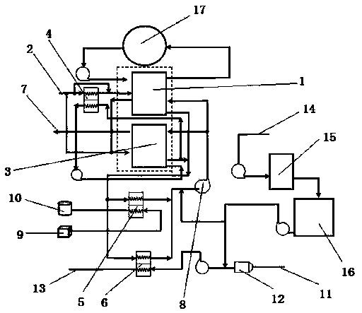 5.根據權利要求3或4所述的油田聯合站污水余熱利用系統,其特征是所述二類吸收熱泵或電驅動水源熱泵用清水經過鈉離子交換器軟化。