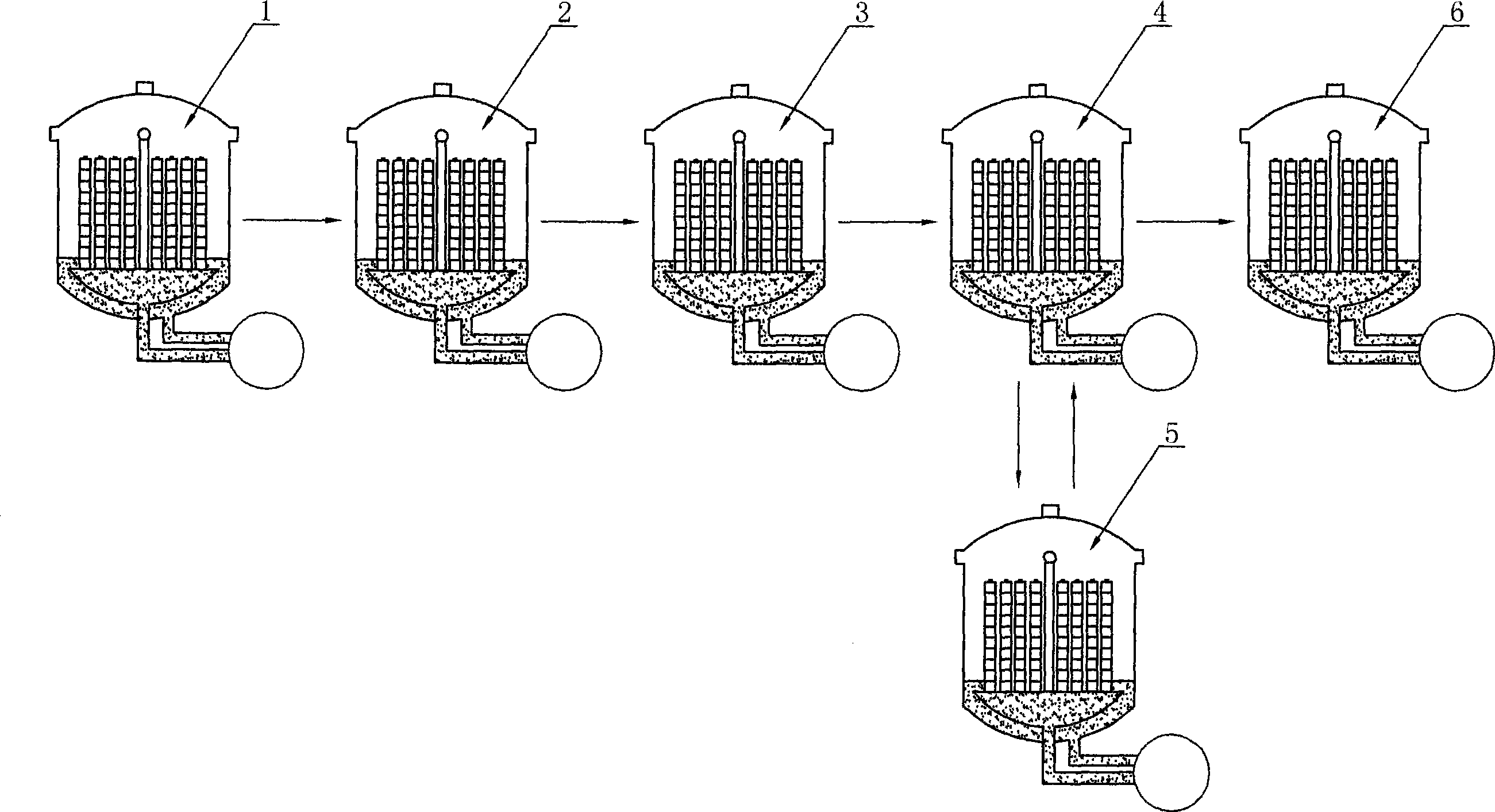 本實用新型工作原理:先通過前處理缸1完成后,吊入第一水洗 缸2中,水洗完成后吊入染色缸3中,染色完成后吊入第二水洗缸4 中,水洗完成后,吊入皂洗缸5中,皂洗完成后排液,進行溫水洗, 溫水洗完成后,再吊入第二水洗缸4中,水洗完成后吊入后處理缸6 中,其中前處理缸1、染色缸3和后處理缸6可續缸,不需要排液, 第一水洗缸2、第二水洗缸4和皂洗缸5末道水洗可續缸,不需要排 液。