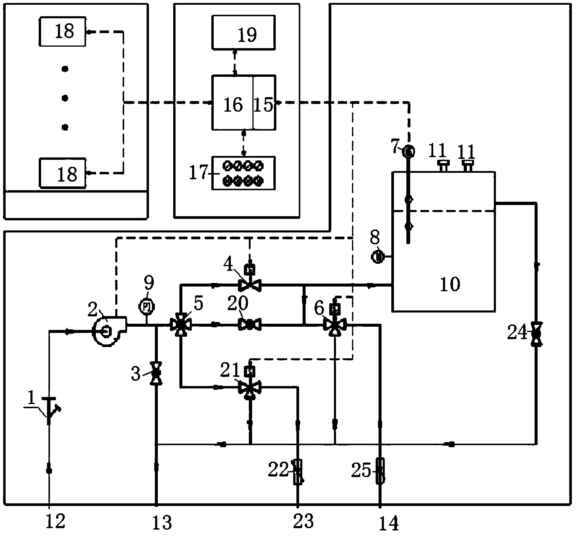 所述多功能取樣及預處理單元包括樣水進口(12)、取樣泵(2)、壓力表(9)、第一回流 穩壓閥(3)、回流排放出口(13)、多路切換閥(5)、節流穩壓閥(20)、管路電磁閥(4)、 第一二位三通電磁閥(6)、第二二位三通電磁閥(21)、第一浮子流量計(25)、第二浮子流 量計(22)、第一分析儀表取樣口(14)、第二分析儀表取樣口(23)、多功能流量池(10)、 第二回流穩壓閥(24);