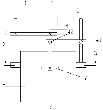 在污水實驗處理過程中,需要將污水中的雜質進行均勻化,以方便對污水檢測等過程中的處理,目前使用的一種簡單的污水攪拌機構,如圖1所示,具有支撐板、支撐臂、橫梁及動力攪拌機構,當容器中污水的高度不同時,需要對動力攪拌機構攪拌高度進行調節,此時需要調節橫梁的高度,以帶動動力攪拌機構的整體高度的變化,一方面由于動力攪拌機構具有一定的重量,在調節橫梁的高度時,橫梁會發生一側傾斜增大調節的摩擦力,給高度調節造成一定的困擾;另一方面由于動力攪拌機構一側重量過大,因此也容易使動力攪拌機構發生傾斜,使攪拌過程不穩定,因此需要尋找一種更加方便調節及平衡的攪拌機構。