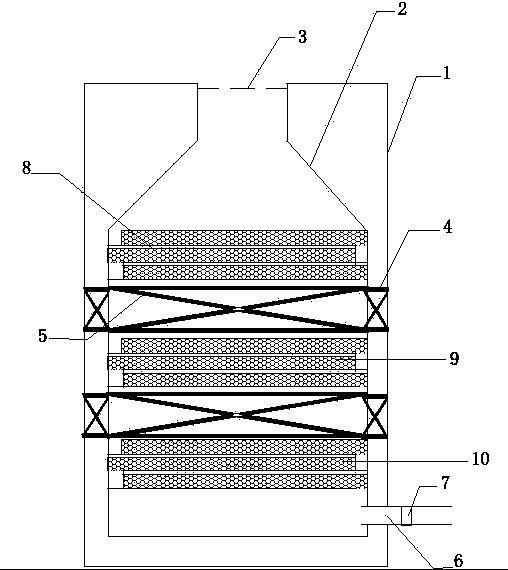 本實用新型的有益效果是:裝置整體結構簡單,由于其采用垂直設計方式,充分利用了重力原理,水流自動向下流動從而節約了資源,由于其采用斷槽多層設計,因而增加了處理能力顯著增加了污水凈化效果。