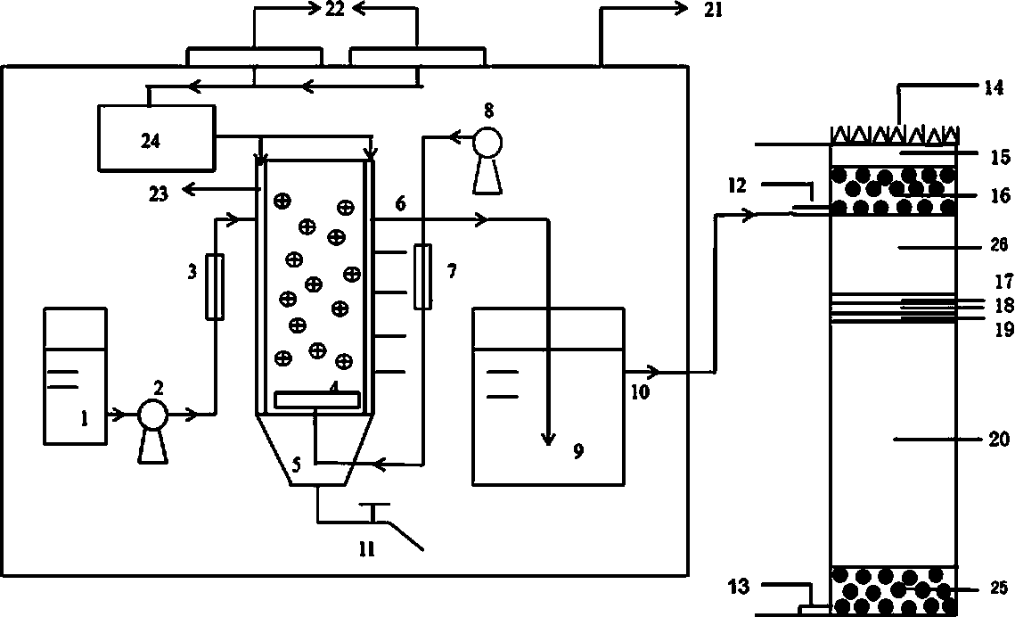 (2)將北方農村生活污水通入到完成掛膜的生物移動床中,通過氣泵向生物移動床中的曝氣頭通空氣,面源污水經過生物移動床的處理后,停止通入空氣,產生的上層處理水通入到沉淀池中;其中北方農村生活污水每天通入量為通入掛膜原料體積的25~50倍,分4~8次通入;空氣通入量為每立方米北方農村生活污水通入800~900ml/min;