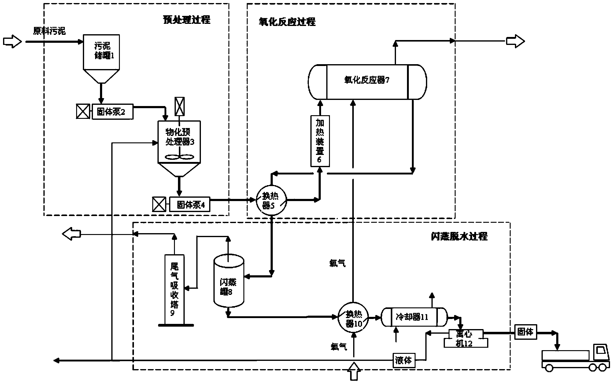 為實現上述目的,本發明采取以下技術方案:一種基于濕式氧化的污泥處理 方法,包括以下步驟:1)預處理過程:原料污泥輸送至污泥儲罐中,污泥儲罐中 的原料污泥由罐底部出口流出,經固體泵輸送至物化預處理器中,同時向物化預 處理器中通入熱的液體,通入的熱的液體質量與原料污泥質量之比為0.5:1~1:1, 使熱的液體與污泥物料充分混合,在物化預處理器中完成對污泥物料的配制后, 污泥物料通過固體泵輸出;2)氧化反應過程:來自步驟1)的污泥物料進入換熱 器的換熱管中,與換熱器殼體內的高溫物料進行熱量交換,熱量交換后的污泥物 料經過被加熱裝置加熱的連接管道輸送至氧化反應器,使得進入氧化反應器中的 污泥物料溫度達到180℃~200℃;同時將被加熱的氧氣通入氧化反應器中,氧氣 的溫度為60℃~80℃,氧氣的通入量為進入氧化反應器內污泥物料COD值的50%~ 70%;污泥物料與氧氣在氧化反應器中發生濕式氧化反應,氧化反應器內的溫度為 240℃~260℃,壓力為4.0MPa~5.5MPa,物料在氧化反應器中的停留時間為 30min~60min,濕式氧化反應后形成氣體和高溫物料,氣體主要為二氧化碳和水 蒸氣,直接排放到空氣中;高溫物料被送入換熱器殼體中,與換熱器的換熱管內 的污泥物料進行熱量交換后,經連接管道輸出;3)閃蒸脫水過程:來自步驟2) 的高溫物料首先進入閃蒸罐內進行閃蒸,經閃蒸后產生的氣體進入尾氣吸收塔凈 化,凈化后的氣體排放到空氣中;經閃蒸后產生的物料經連接管道輸送至換熱器 的換熱管,對進入換熱器殼體內的氧氣進行加熱,被加熱后的氧氣經連接管道輸 送至步驟2)中的氧化反應器;從換熱器輸出的高溫物料再經冷卻器冷卻,溫度降 至60~70℃,然后經連接管道進入離心機進行固液分離;經離心機分離出的液體, 一部分作為熱的液體被輸送進入步驟1)中的物化預處理器中與原料污泥進行混 合;另一部分液體返回污水處理廠進行再次處理;經離心機分離出來的固體輸出, 進行二次利用。