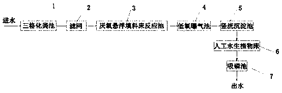 本發(fā)明的有益效果為:本發(fā)明所述的厭氧懸浮填料床反應(yīng)池可以將污水中難生物降解物質(zhì)轉(zhuǎn)變?yōu)橐咨锝到馕镔|(zhì),有效提高了農(nóng)村生活污水處理效率;而低氧曝氣池不需要連續(xù)曝氣,降低了裝置長期運轉(zhuǎn)所需費用;且利用人工水生植物床進一步凈化污水中的N、P的指標;此外,本發(fā)明對農(nóng)村生活污水的處理效率極高,出水水質(zhì)可以達到《城鎮(zhèn)污水處理廠污染物排放標準》(GB 18918-2002)中的一級A標準,同時占地面積小,投資省,運行管理維護簡單,運行維護費用低。